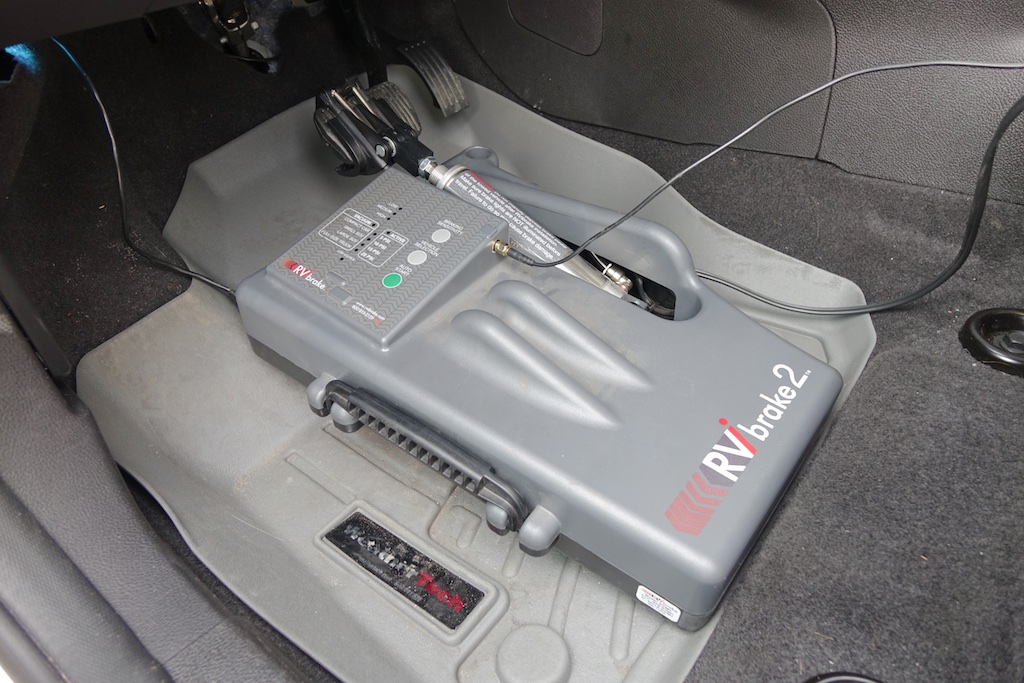 Braking systems take two approaches. One system is truly invisible as it's mounted under your hood and ties into the hydraulic lines of the brake. One of the big downsides of this type of system is that it requires both an installation when you set up your car and a de-installation when you go to sell it. The more common braking system is one that sits on the floor on the driver's side and has a pneumatic arm that clamps to the break pedal. When the internal accelerometer senses the RV is slowing it triggers the arm to press down on the brake pedal. It's a very high tech way to do a low tech thing.
