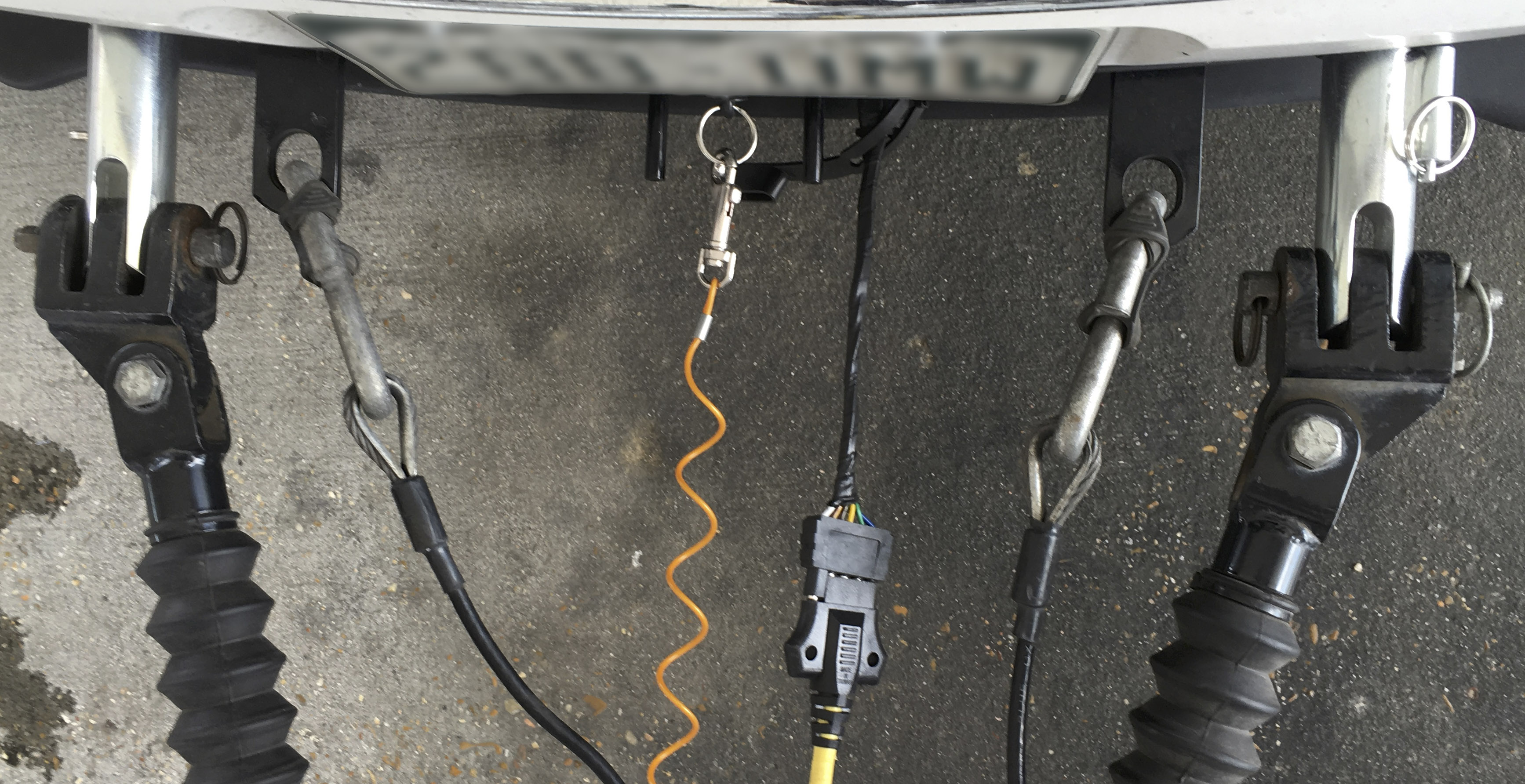 Looking straight down. The towing bars are attached to the removable posts and locked with retaining pins. Inside the tow bars are the safety cables. In the center the thin wire is the breakaway that, if the car becomes detached, the inside braking system will stop it. The yellow cable with wide connector is the 7-way electrical and light connection.