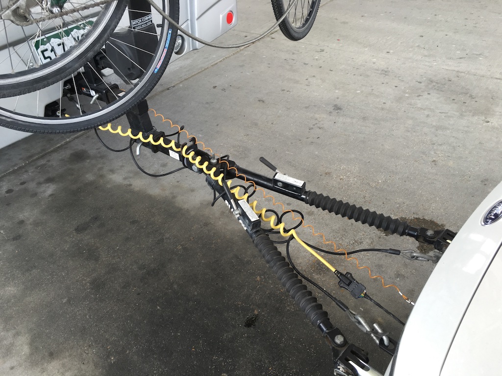 All set up and ready to tow. We use a dual receiver for our hitch that allows us to install a hitch-based bike rack. This solution means we can leave the bikes locked on the rig when we use the car. If you install a tow receiver on your car, you can then easily transfer the bike carrier for even more extended biking options.