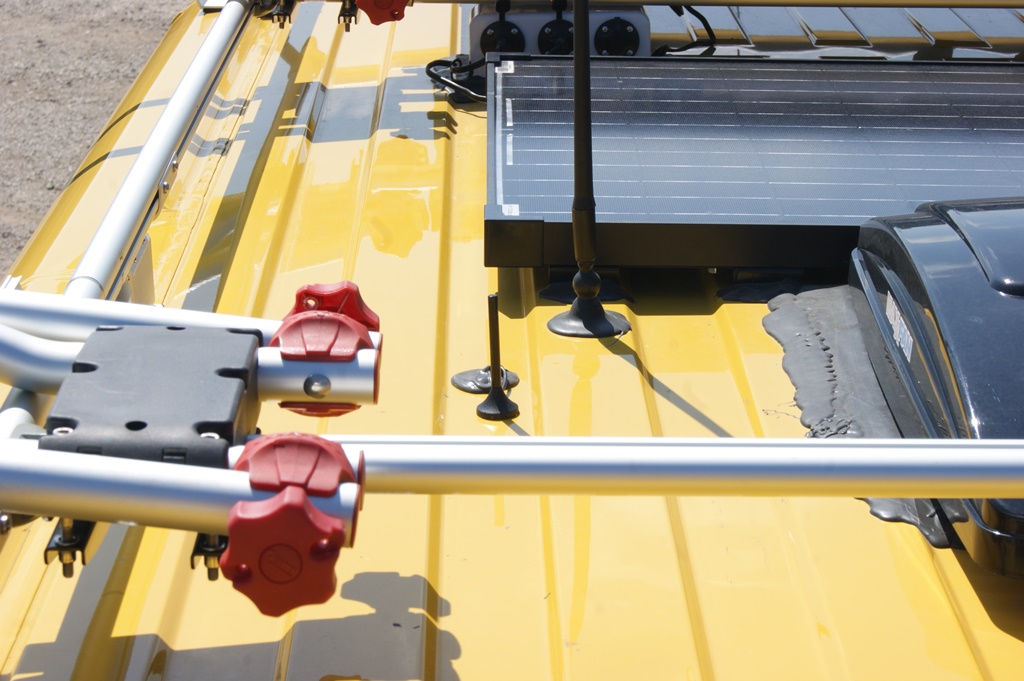 First up is the external antenna. You can see it in the center of this picture. weBoost provides a small, magnetic mount antenna which works great on the metal roof of our class B van. Besides an easy mounting surface, the other advantage our metal roof provides is that it serves as an enormous "ground plane". Without getting too deep into antenna theory, a ground plane is a reflective body at the base of the antenna that greatly improves reception. A ground plane for cell signals should be a minimum of 8 inches across. With 140 square feet of metal roof, I think we're covered!