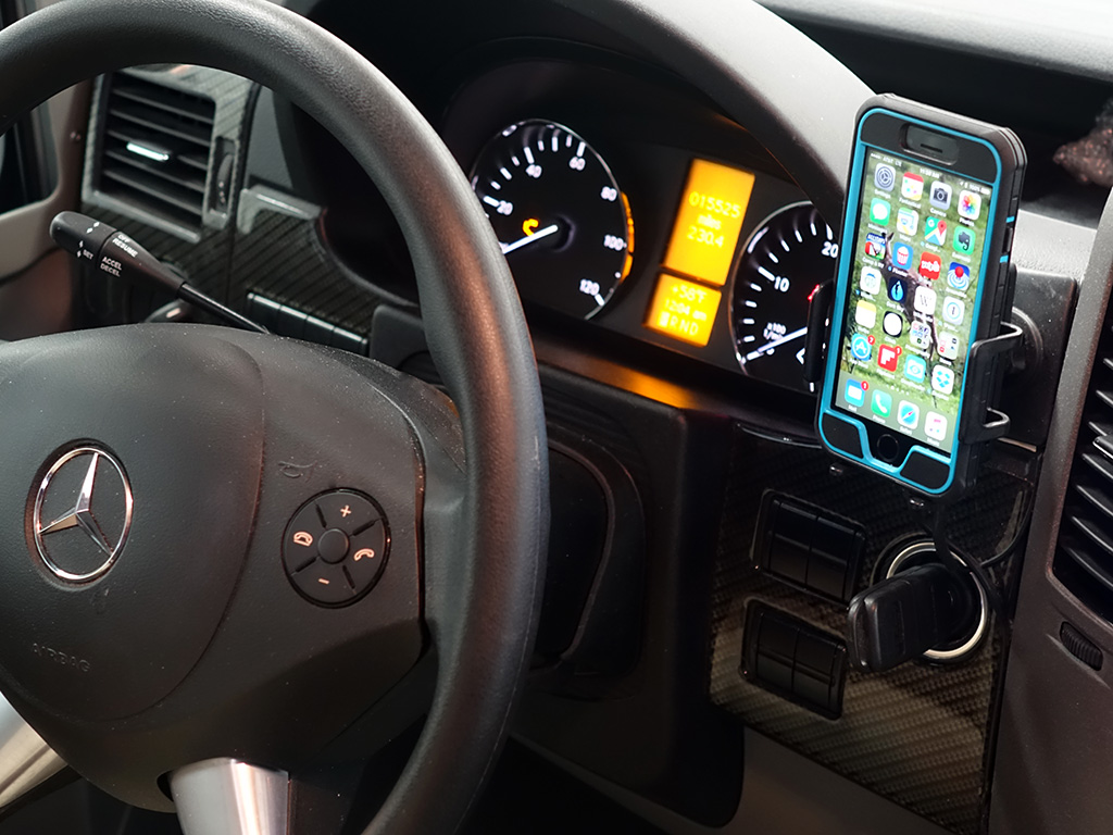 Don mounted the cradle right above the ignition on the Navion's dash which gives him great visibility to his phone when using apps like iExit. He used 3M OnCommand mounting tape for easy future removal, but then applied a heavier duty construction glue between the cradle's back to keep it from peeling off when the front of cab gets warm in a parking lot.