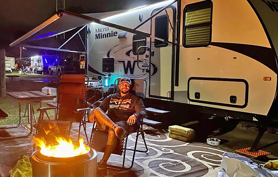 Sitting outside of towable by fire at night