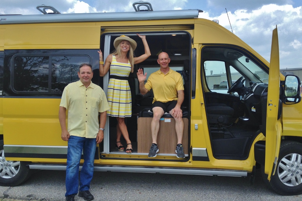 Meet our new baby. The RV I mean, not Russ. (That's Russ Garfin standing with us, the product manager of all the small WGO coaches and all around super awesome guy.)