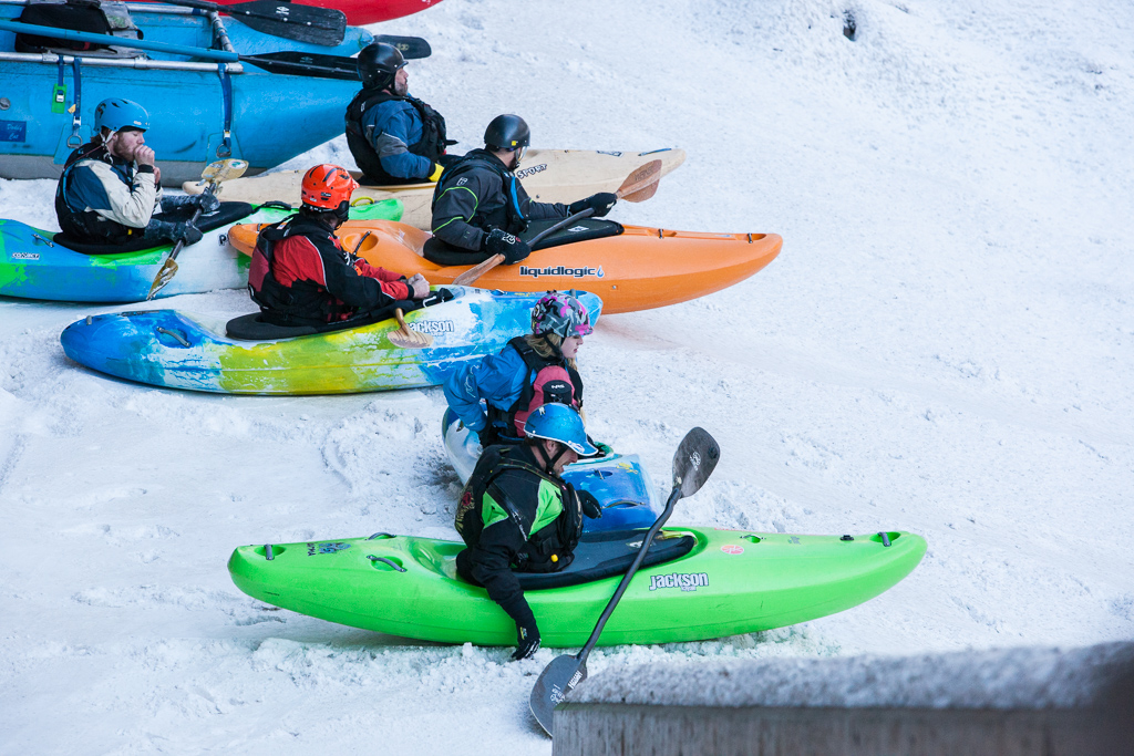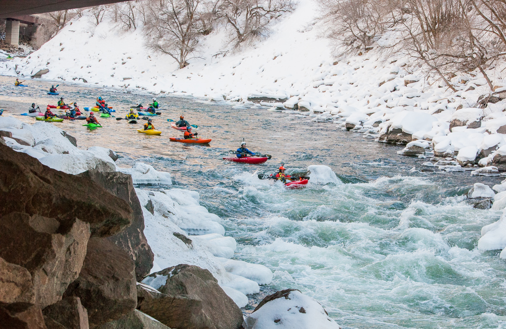 The boat ramp is a chaotic flurry of activity as paddlers fumble with wooden fingers and frozen gear. One by one, the kayakers slide down the snow covered boat ramp and splash into the semi-frozen river. They pick their way through snow covered rocks in the river that resemble white-frosted cupcakes. The colorful boats glisten against the stark winter landscape like Christmas lights on a tree. Triumphant calls of delight echo up and down the riverbed at regular intervals. It is truly a celebration worthy of the genesis of a new year.