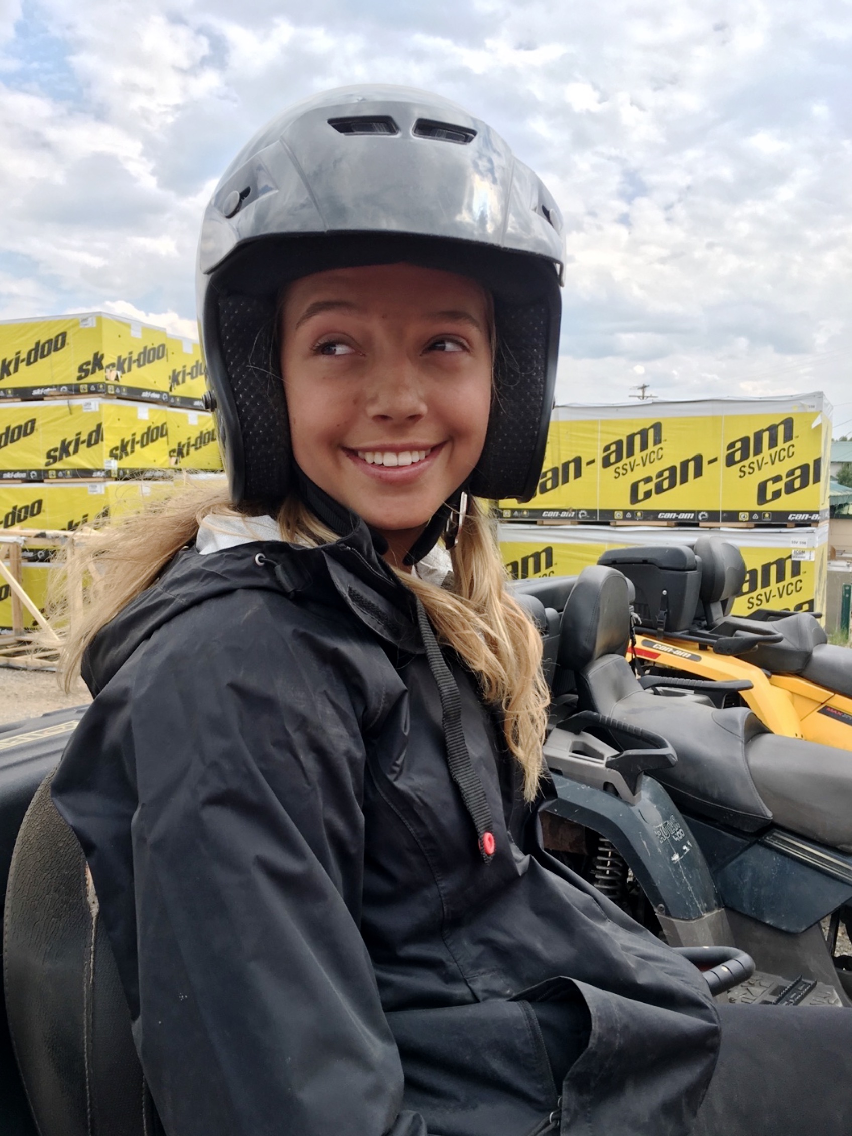 Girl with helmet on smiling.Coated with dirt, but still smiling post 4-wheeling in Leadville, Colorado. Photo credit: Mike Beltz
