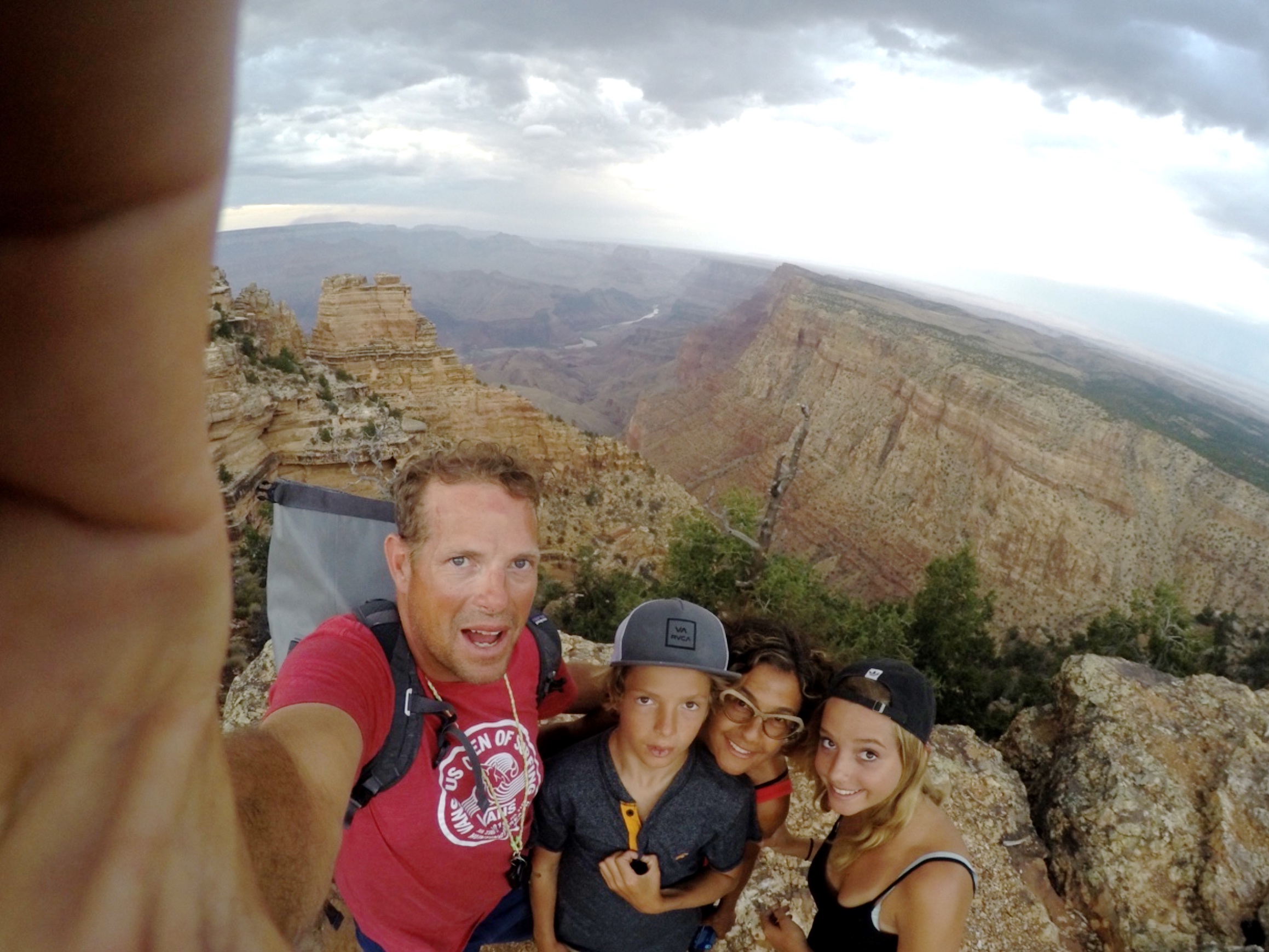 Family selfie with canyons and river below.Selfie on the Rim. Photo credit: Mike Beltz