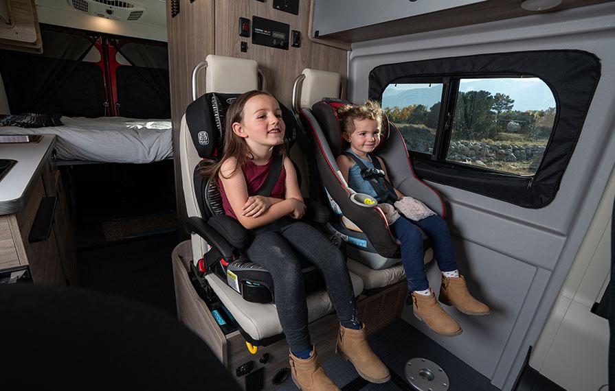 Three-point seatbelts – with a strap that goes across your lap as well as your body – are often the standard for safety in most vehicles. Having front-facing seats is also ideal, and many RV dinettes offer those front-facing seats with secure seatbelts already installed. Multiple Class B vans even have dedicated front-facing passenger seats behind the driver and co-pilot.