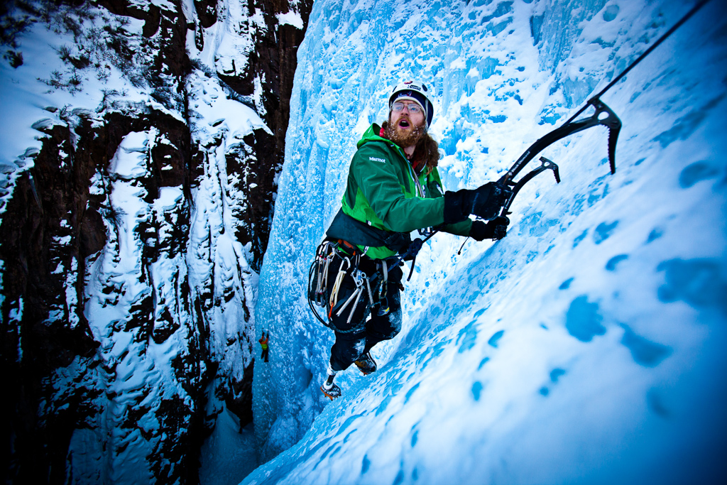 Man climbing icy cliff-side.Amputee, Chad Jukes is full of emotion as he reaches the summit of an ice climb in Ouray, CO.