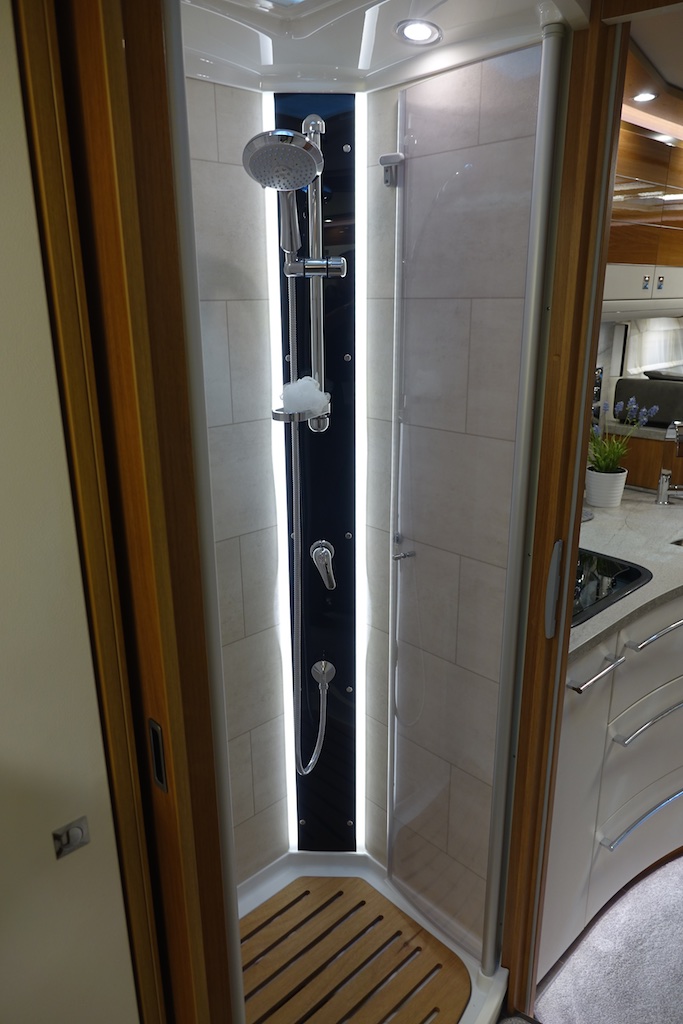 Classy shower in a low priced RV.A six-figure coach shower? Nope, it's in a Class C priced under $90,000.