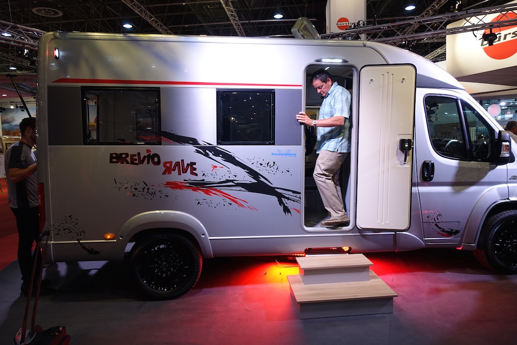 Russ Garfin in one of the ruggedized sport coaches on display at the show. Winnebago product manager, Russ Garfin, assess the potential market appeal of a ruggedized sport coach for active adventurers.