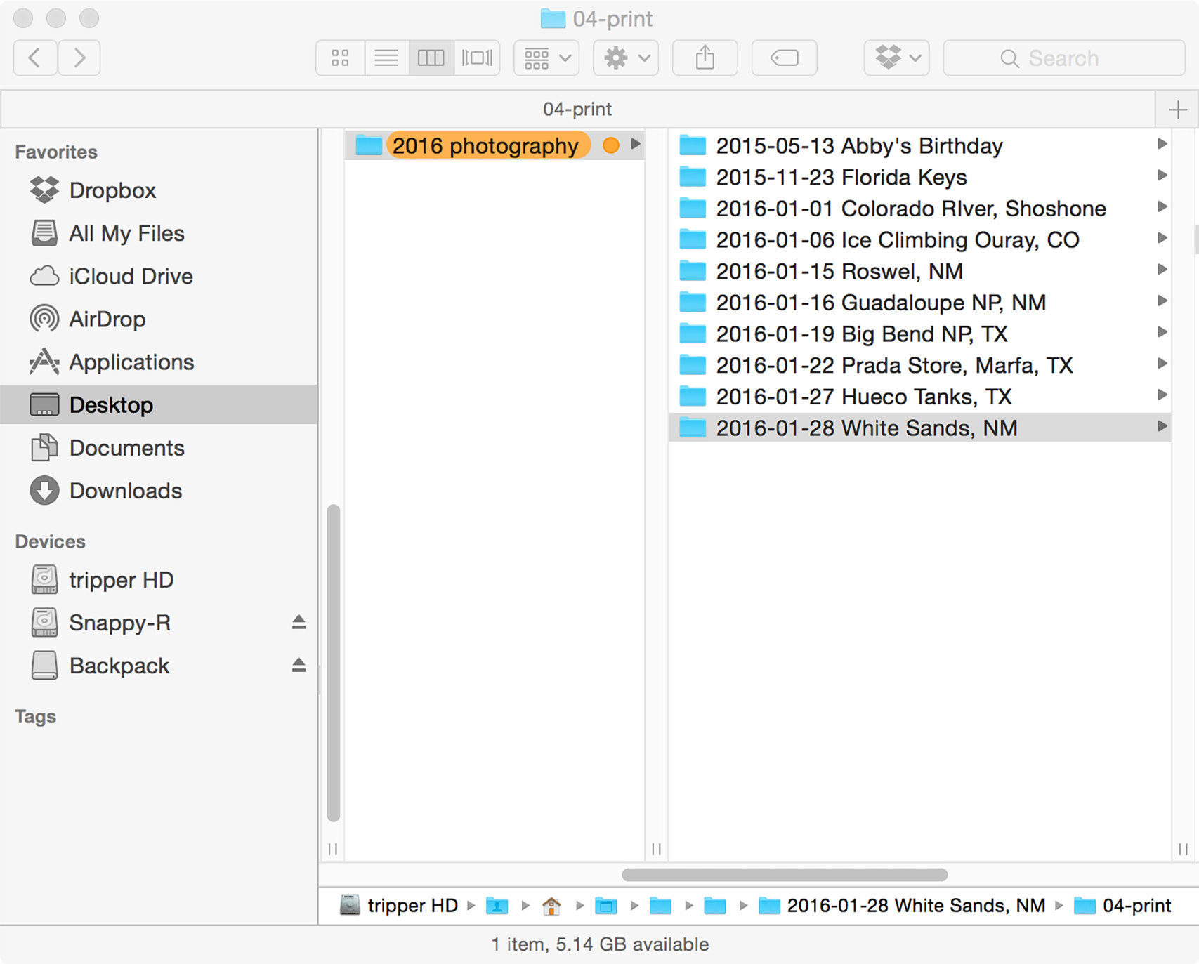 1. Download your camera after every "shoot". We break everything that we do into discrete increments so that we can easily sort through our files after the fact. I would recommend downloading by either location or event - whichever is more relevant for you. For example, we just spent four days at Big Bend National Park. We saved all of the images from that four days in a folder labeled with the date and location so that we can easily find them years from now. (Sample Filename: 2016-01-29 Big Bend National Park. NOTE - if you put the year first, then all of your events will be sorted chronologically.) Do not put anything else in this folder! If you are diligent about downloading after each location/event, your files will be quickly and easily organized and your camera will be cleaned off and ready for the next adventure - if you delay downloading until your camera is full, you will find yourself with a disorganized mess that is too overwhelming to deal with.