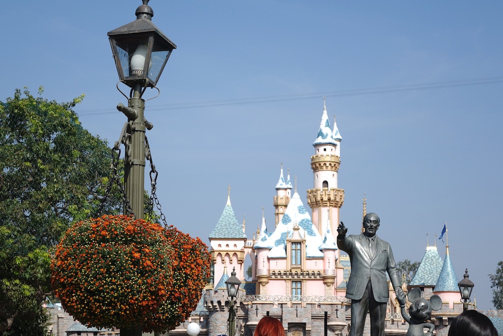 Statue of Walt Disney and the Castle at Disneyland.