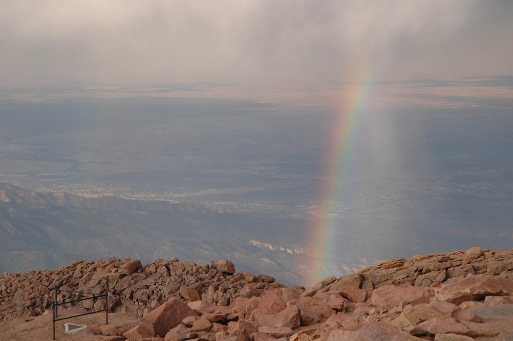 Then again, on the very next day--the Fourth of July--we rode an incline cog railway to the top of Pike's Peak. While we were strolling along the summit on a sunny-but-breezy day, snow flurries began to fall, followed by a rainbow (snowbow?) arching across the sky. So on Independence Day, as we stood atop the mountain that inspired "America the Beautiful" and the "purple mountain majesties," Mother Nature threw us a party with some natural confetti.