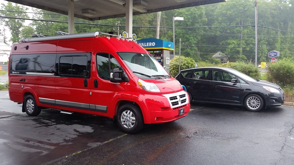 Red Winnebago Travato parked at a gas station.Roxanne with our other car, which doesn't have a name and gets twice the miles per gallon!