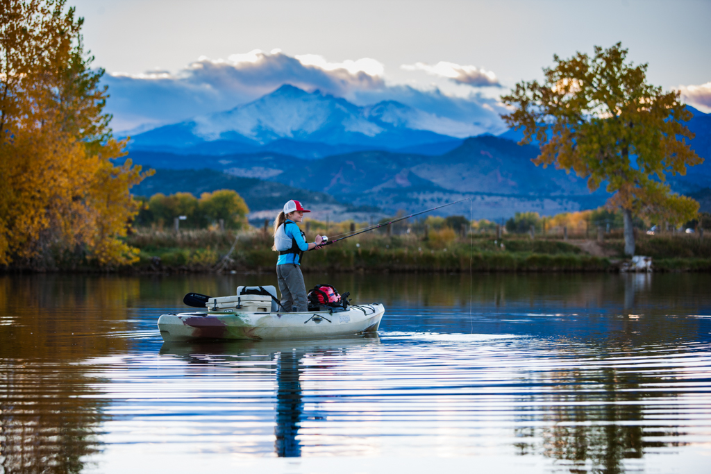 Abby spin casts below Long's Peak, one of Colorado's 14,000' mountains.