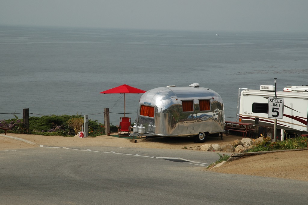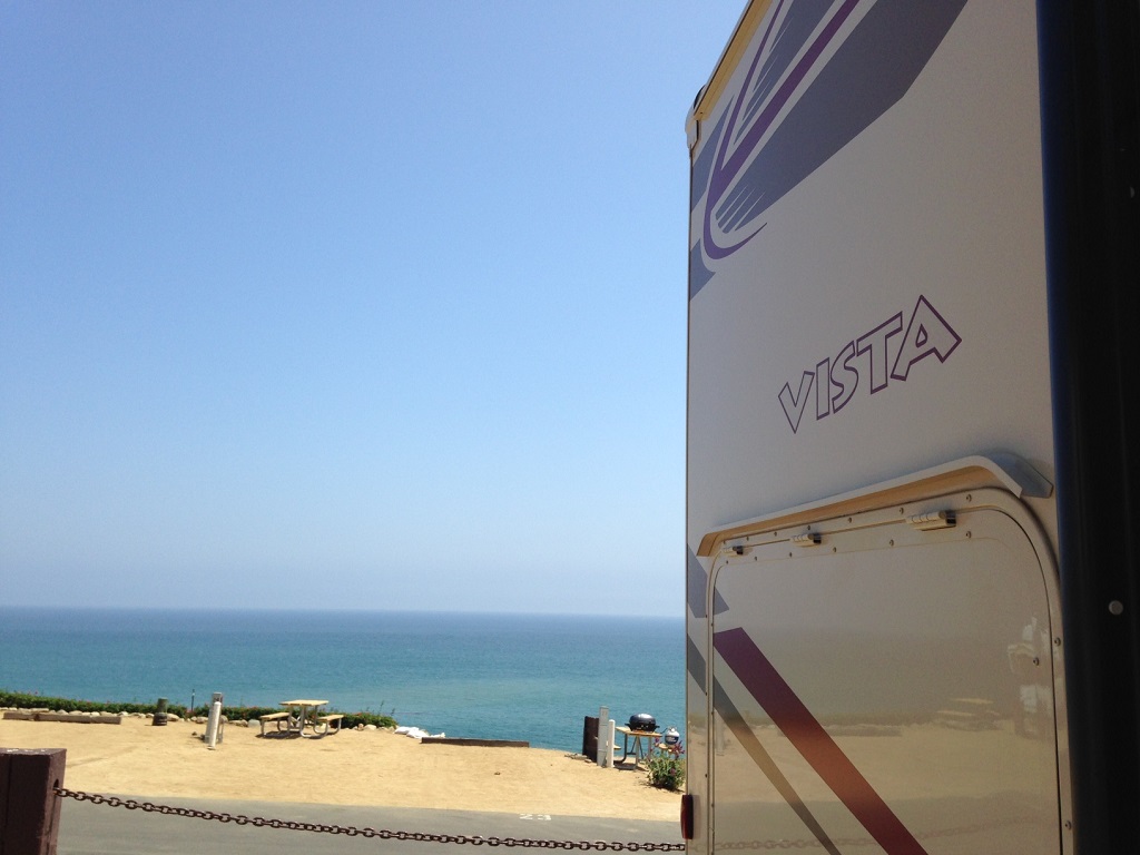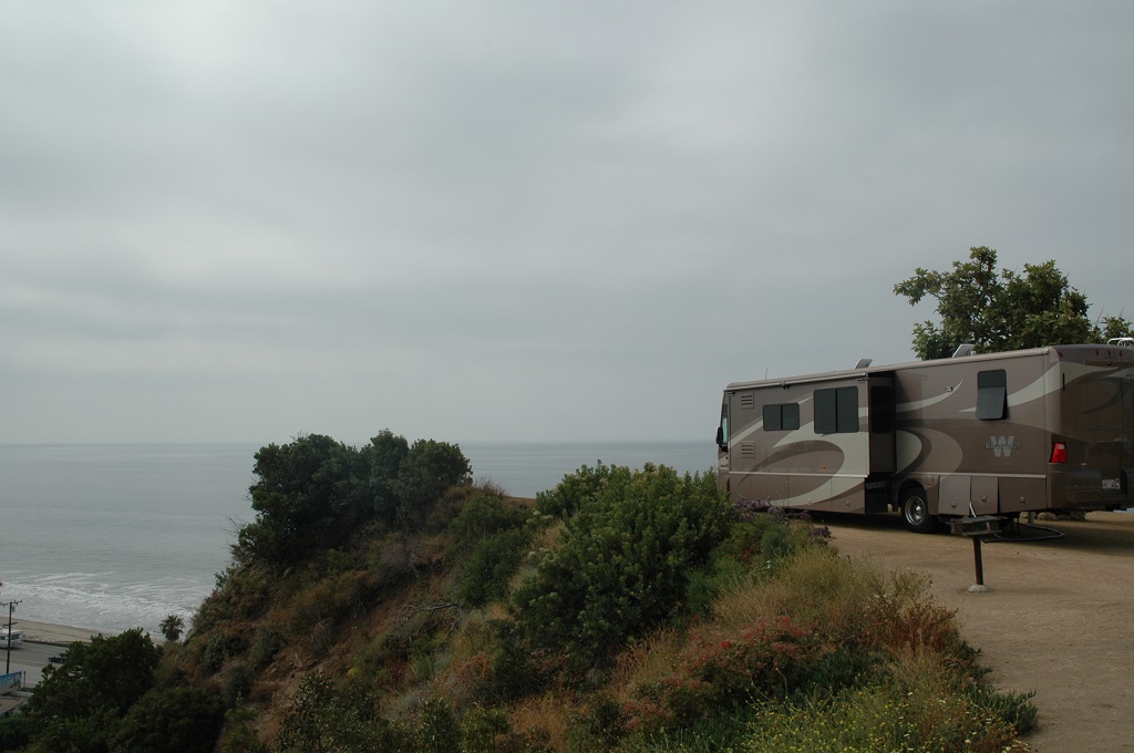 The RV park even has its own tagline, like a movie poster: "Where the summer spends the winter." Well, it was late December, and the park was relatively new, and there was hardly anyone there. So we got the prime spot--a corner site, a few hundred feet above the Pacific Coast Highway, with a million-dollar view of the Pacific Ocean.
