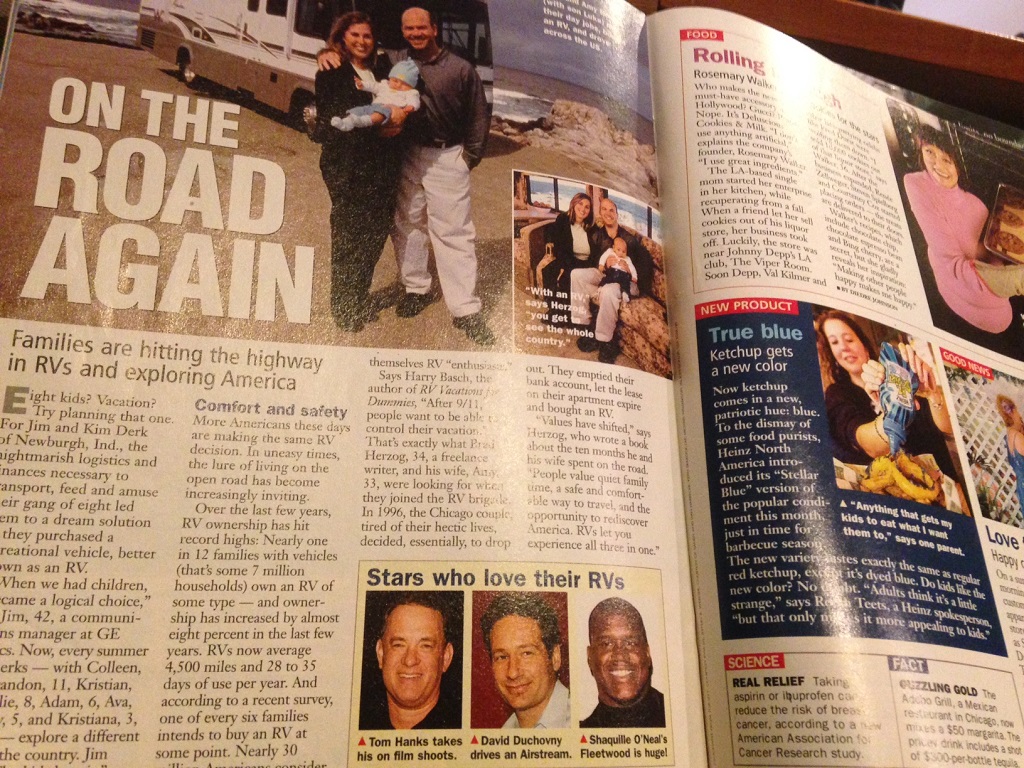 Sixteen years ago, a relatively new magazine called In Touch put together a one-page article about how "families are hitting the highway in RVs and exploring America." The story included a half-page photo of Amy and me and our infant son Luke. Of course, this being In Touch magazine, where the adjacent stories were about baking cookies for movie stars and a blue ketchup "craze," the road-tripping story also included three photographs of "Stars who love their RVs." As you see below, there were MUCH SMALLER photos of Tom Hanks, David Duchovny and Shaquille O'Neal.