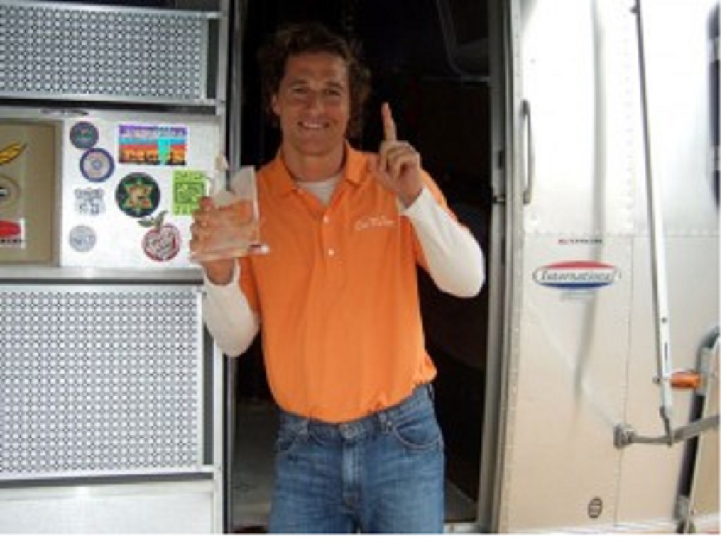But we just want to chat with McConaughey. That's all. Because, several years before he won his Oscar, McConaughey received another prize, this one slightly less talked about. It's called the RV Industry Association's Spirit of America Award. Here's the one grainy pic I could find of McConaughey actually holding it. He's even wearing a "Go RVing" shirt.