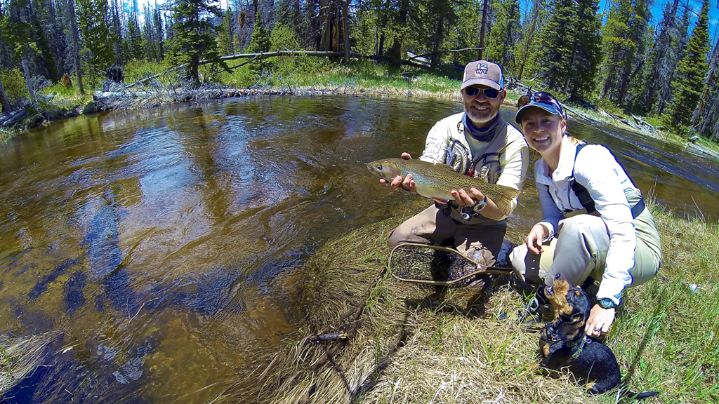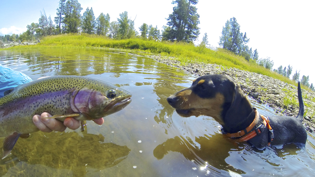 Nose to gill. Tripper meets an Idaho rainbow. Who says Daschunds don't like water?