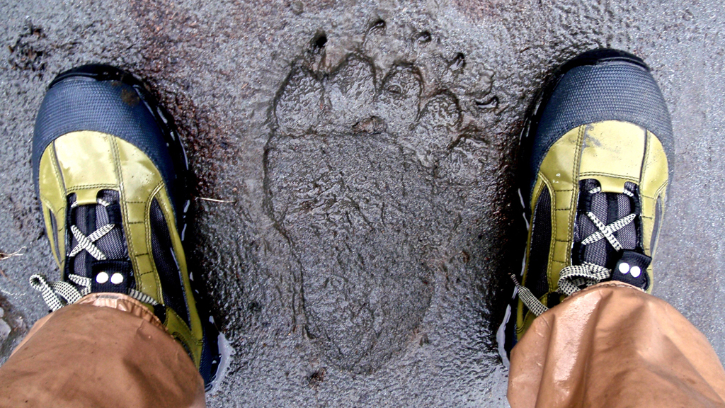 Safer at a distance. Damon sizes up a brown bear print in Alaska.