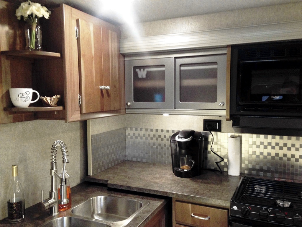 #8 The backsplash is trendy and shiny, unlike the horrendous wallpaper that's been used in all RVs since 1985.