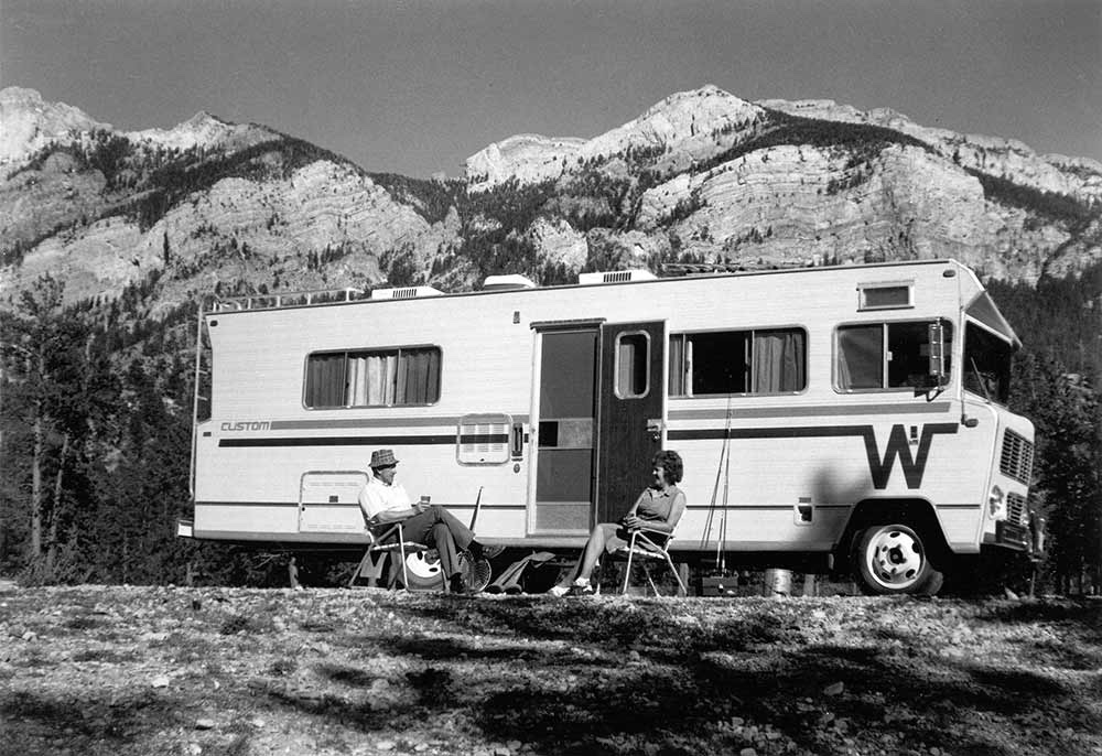 Old black and white photo of a couple sitting outside their Winnebago with mountains in the background