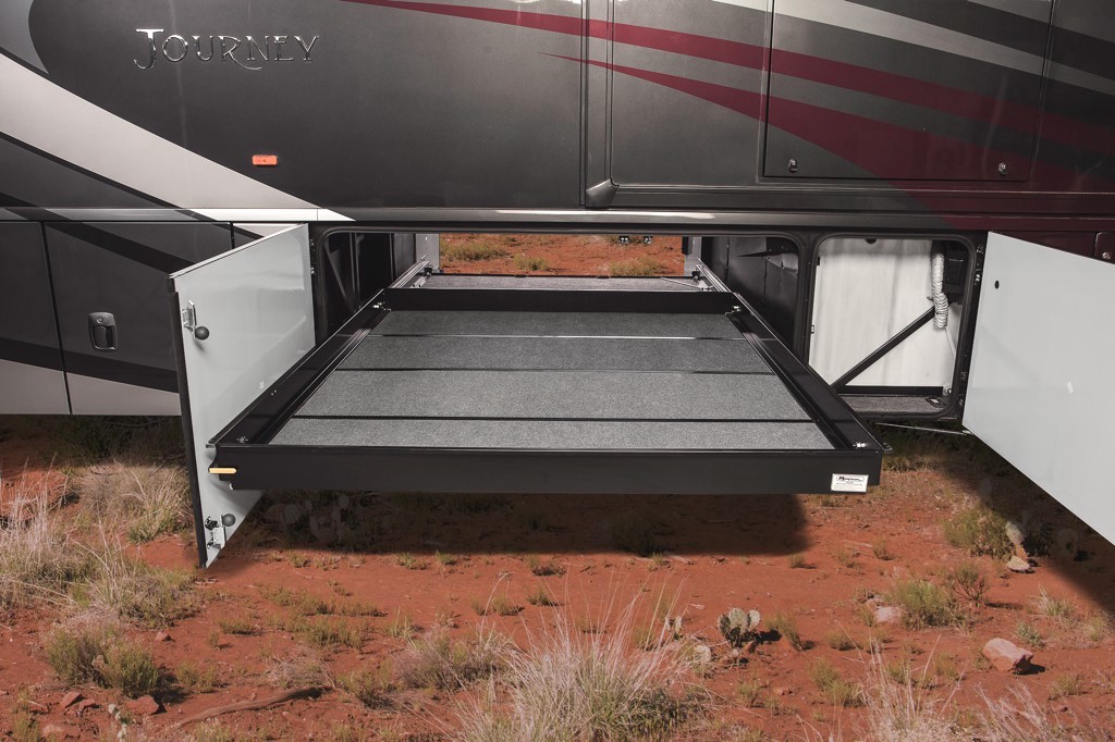 Another Winnebago exclusive is our Maxum Chassis. By lowering the frame rails the handling characteristics of the motorhome improve, but when you hook up at your site the real magic unfolds with huge roll-out storage. Not only can you have it all. . .you can take it with you.