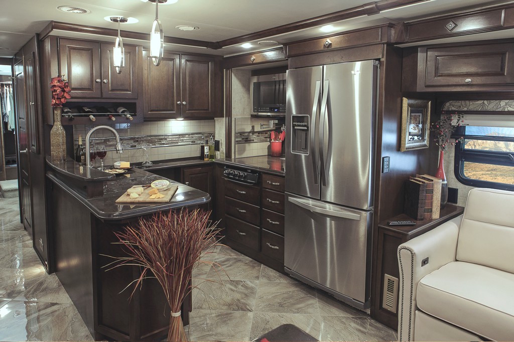 Don't use the word galley for this one. Feature #1 in the 38P floorplan is a brilliant wraparound kitchen design that offers a countertop extension and behind the sink riser. This is perfect for complex meal prep before, and serving later. Feature #2 is the pot filler faucet behind the range. Beyond the convenience, this luxury residential feature points how how easy it is for two people to be working at the same time.