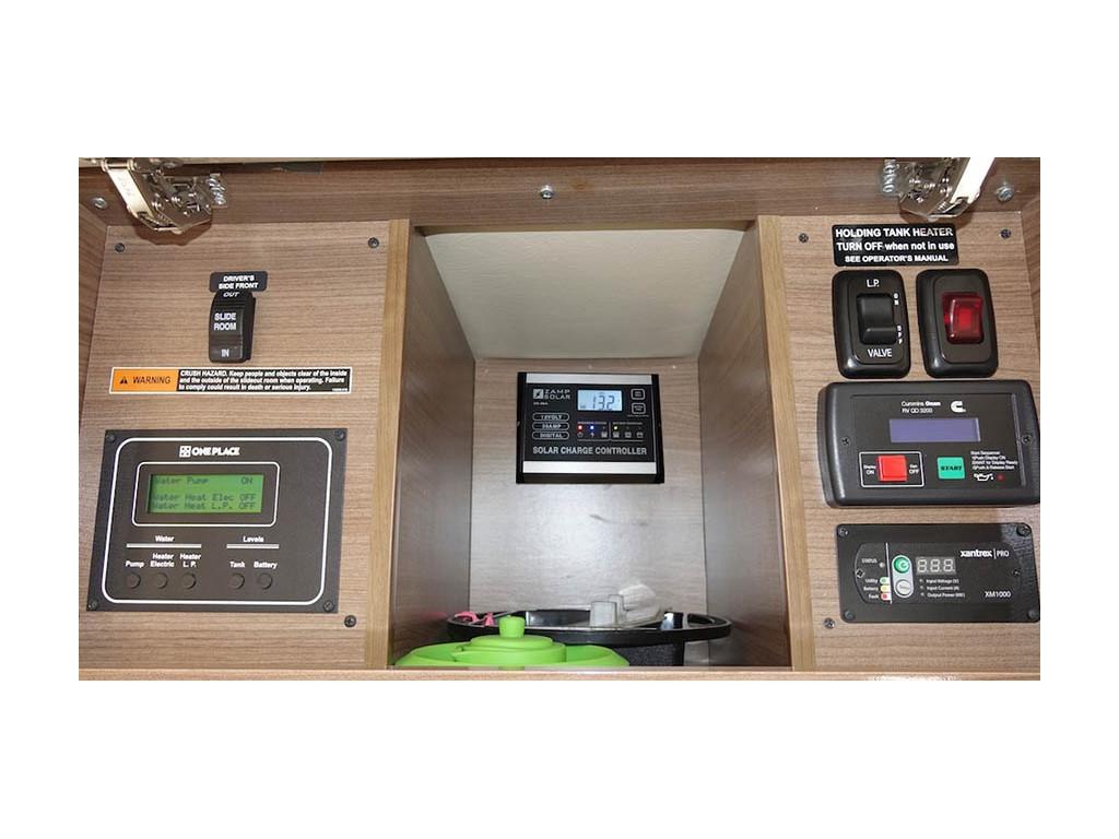Tucked away behind a cabinet door are the coach controls and the Zamp Solar monitoring panel.