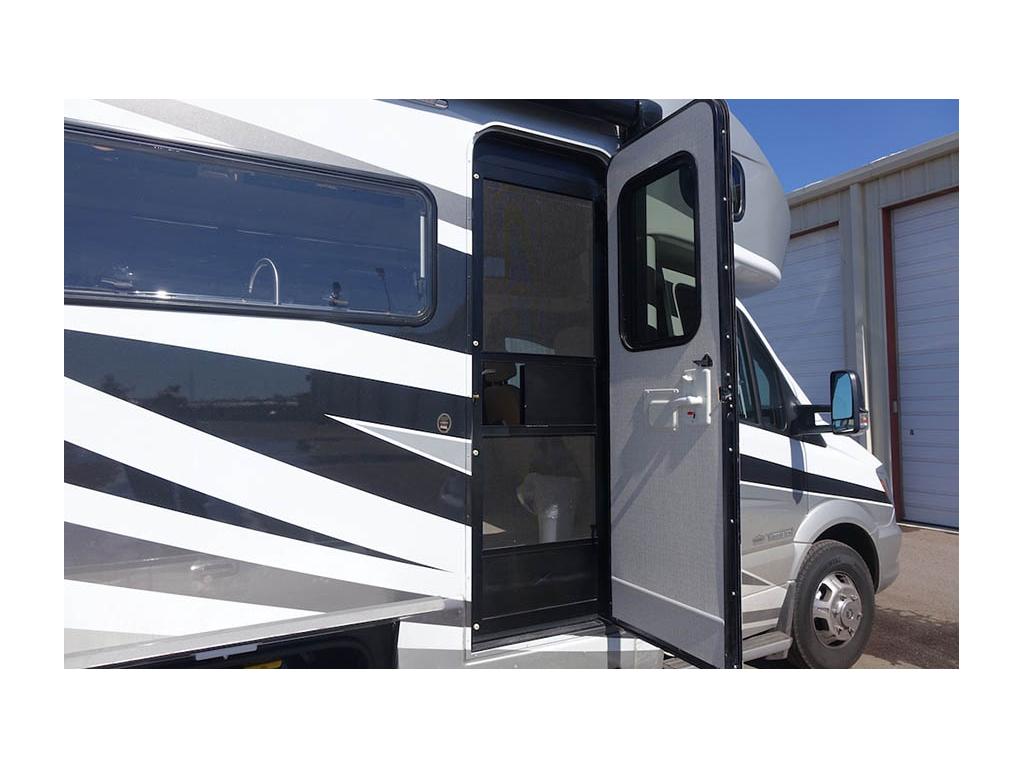 Entry Door. And while we’re on the subject of gas struts, let’s talk about the front door. The gas strut holds it open at a 90-degree angle which now eliminates the tendency to swing in the way of the awning when it’s being extended. This also eliminates the metal anchor rod we used to have to use to hold the door fully open. Adding the strut required more structural reinforcement of the door and it feels very substantial. Best yet, many View/Navion owners (including us) fought the issue of a going down the road squeak coming from the door latch. This seems to have been fixed with the new door and we've never heard a peep.