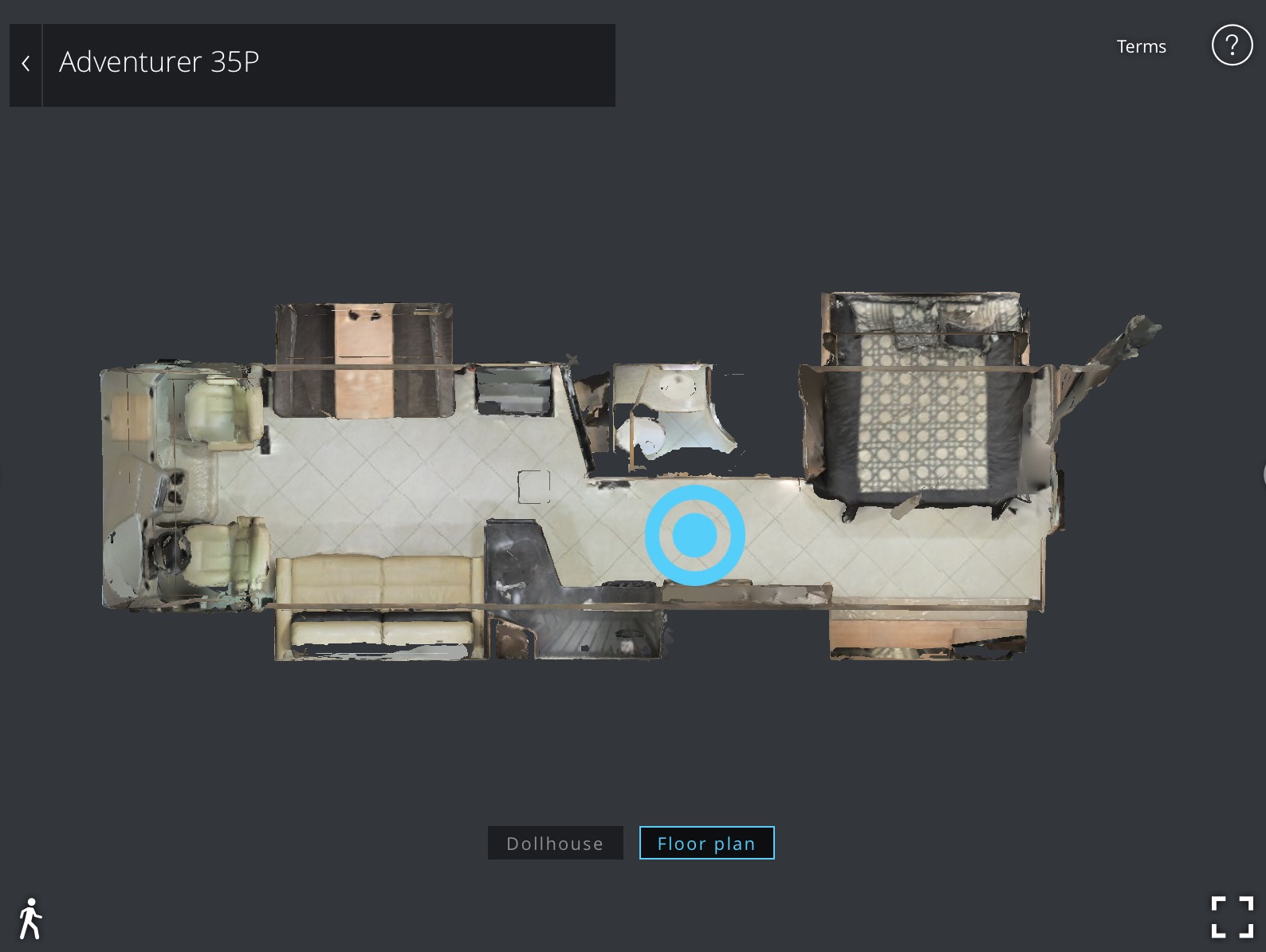 Today, there are over 20 coach interiors on the Winnebago product web site and the plan is to ultimately have 3D images of every available floorplan. When you're viewing a WinnVision image you'll see a series of circles. These are your navigation viewpoints and the actual location of where the scanning camera was placed. For a really impressive experience you can enlarge the image to full screen by clicking on the frame box in the lower right had corner. You can navigate through the image either with your arrow cursor keys or mouse/trackpad. If you're on a phone or tablet, simply tap and drag your finger.
