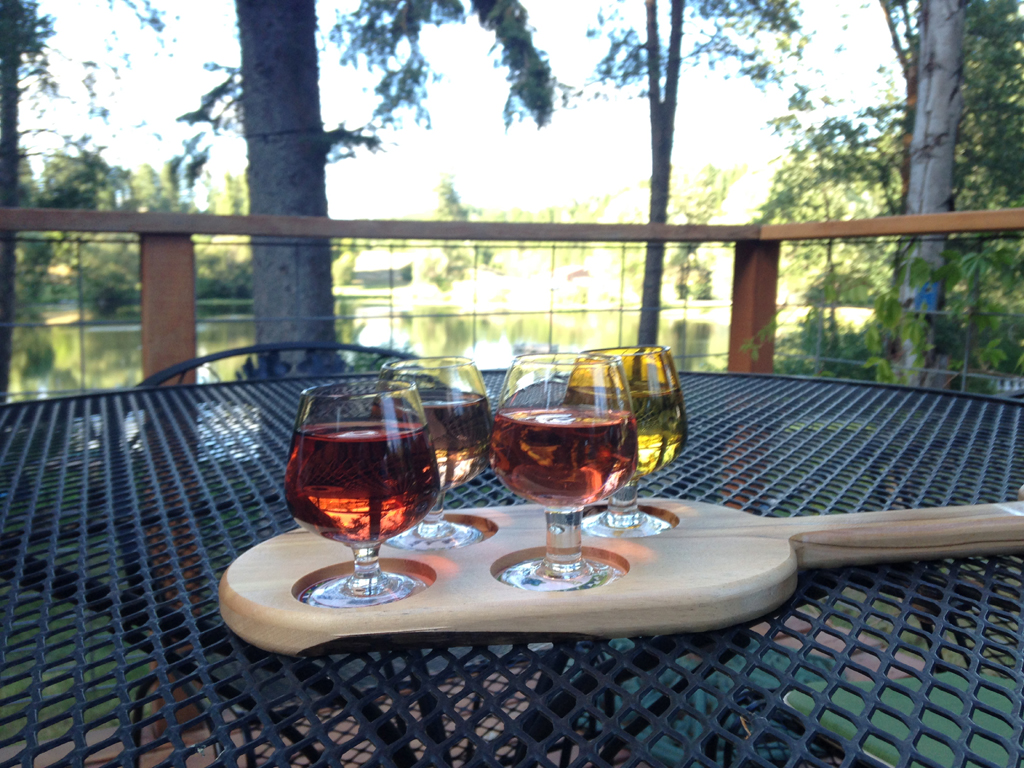 Flight of 4 wine samples sitting on a table with a view overlooking the lake.