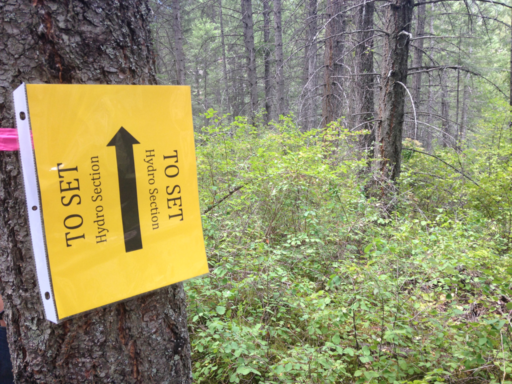 Yellow sign with arrow pointing in to the woods that reads "To set Hydro Section."