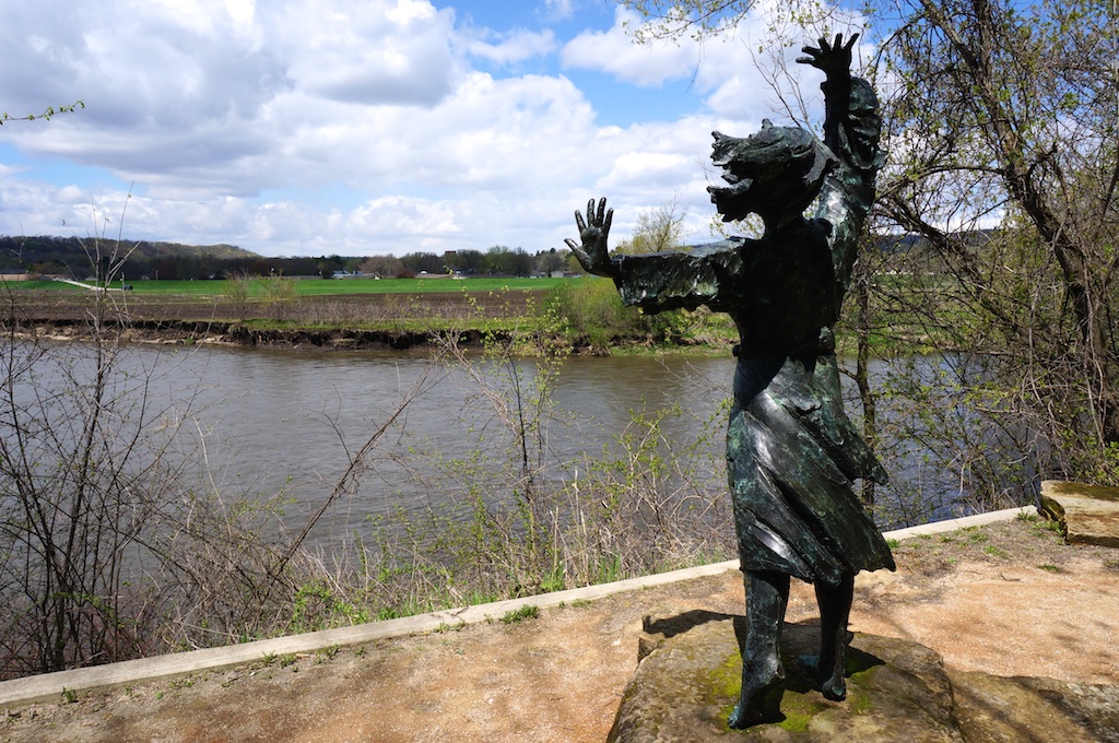 Statue of a girl along the river.Art and nature come together along the Upper Iowa River at Decorah.