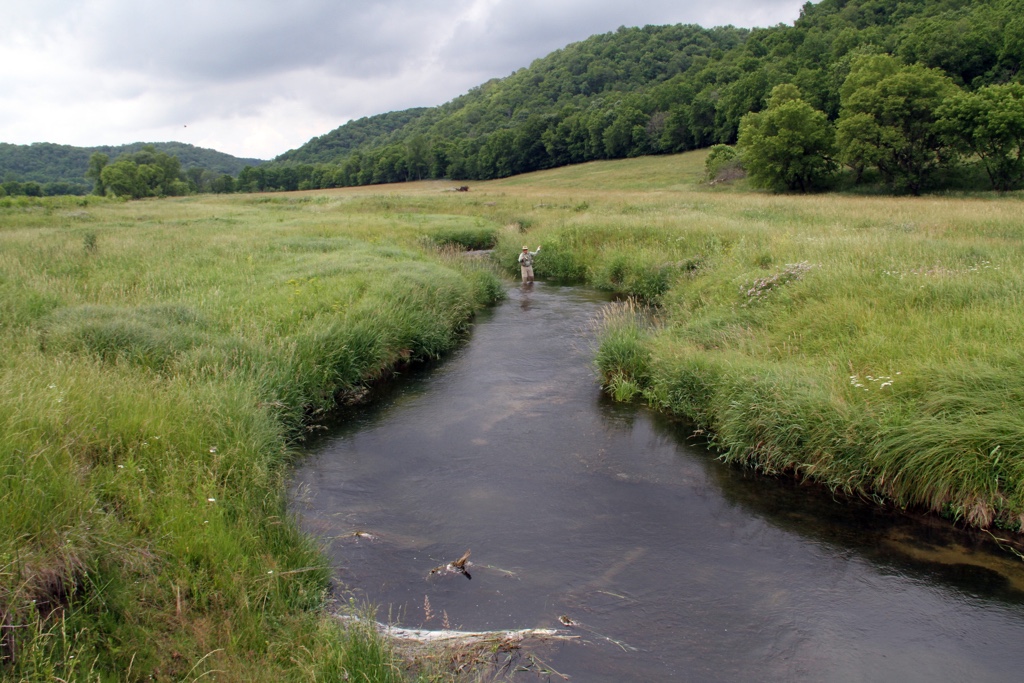 Person fishing in shallow stream alongside tree covered hills.A Rocky Mountain trout stream? Nope, this is one of many streams in the Driftless area.