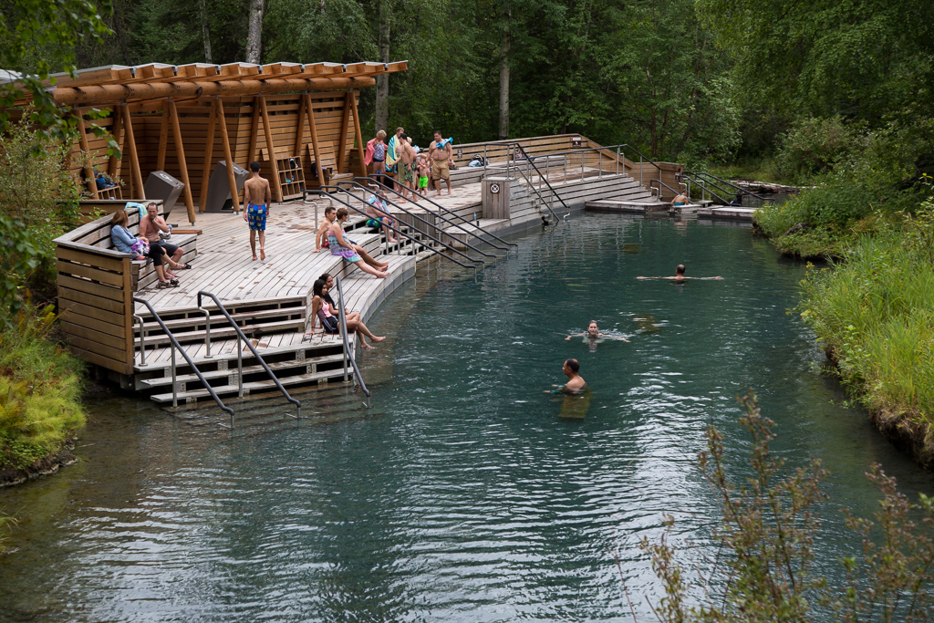 The Laird Hot Springs is a mandatory stop on the Alaskan Highway. There are two pools that start at 125 degrees at the source of the spring and that cool to around 70 degrees as you make your way downstream. While at the park, it was berry season and the park was overrun with black bears. At dawn we saw a mother and her cub right outside the RV, and Abby and I spotted a moose on our early morning walk to the springs.