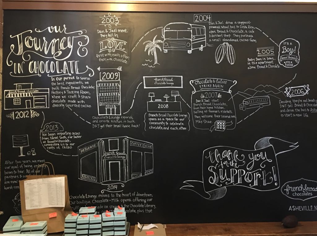 Chalk board showing the journey of how French Broad Chocolates came to be.The journey that lead to French Broad Chocolates started when a young couple took their skoolie (converted schoolbus) on a drip down to Costa Rica and ended up purchasing a small, abandoned cacao farm. Love it.