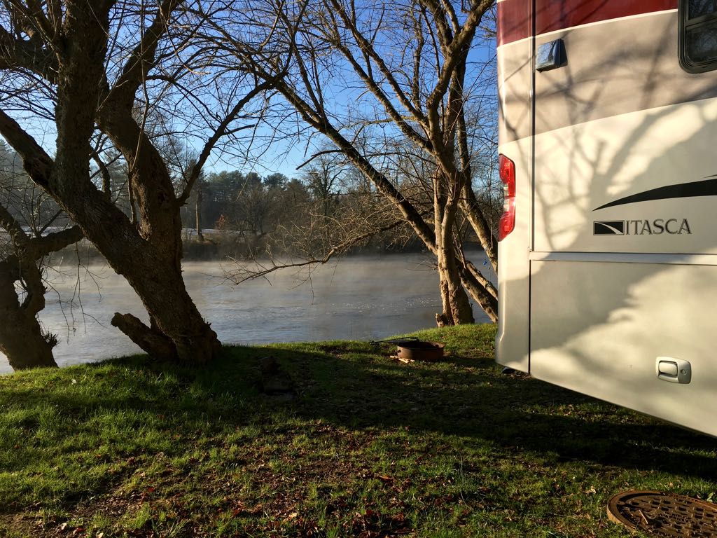 Itasca motorhome parked next to the French Broad River with steam rising.Our rig stuffed into a spot at Wilson's Riverfront RV Park that backed up to the French Broad River.
