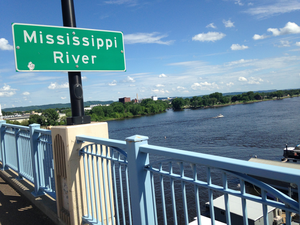 Sign for the Mississippi on bridge above the river.