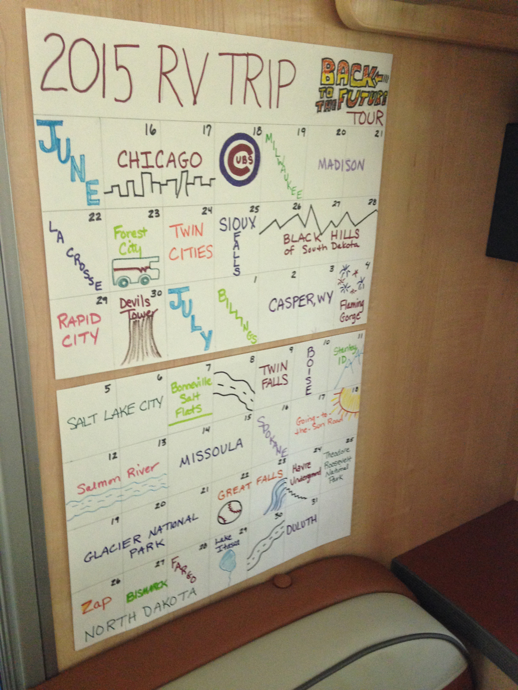 My goal is to maximize the experience. Take advantage of every day on the road. So while I'm no Boy Scout, "Be prepared" is my motto. Case in point--here's our June-and-July calendar: