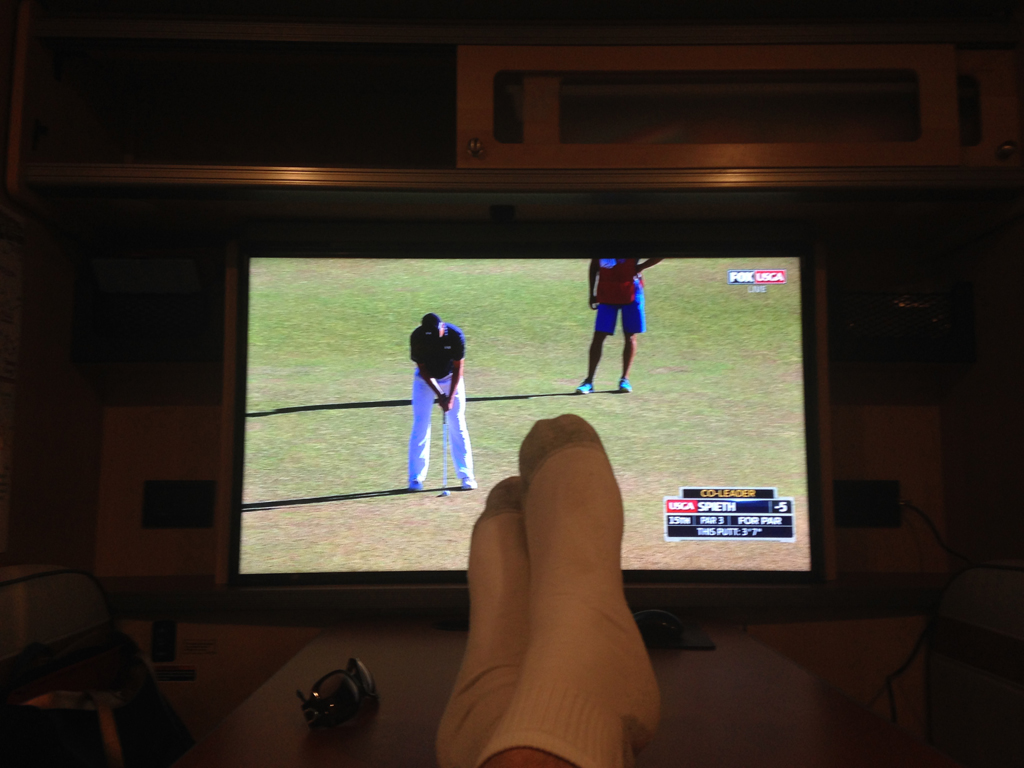 Sometimes you just want to put your feet up. And when your retro-designed Winnebago Brave comes equipped with two LCD TVs, including a 46-inch whopper that pops up from behind the dinette... well, that's the next best thing to being there (this year's Open was played at Chambers Bay Golf Course in University Place, Washington).