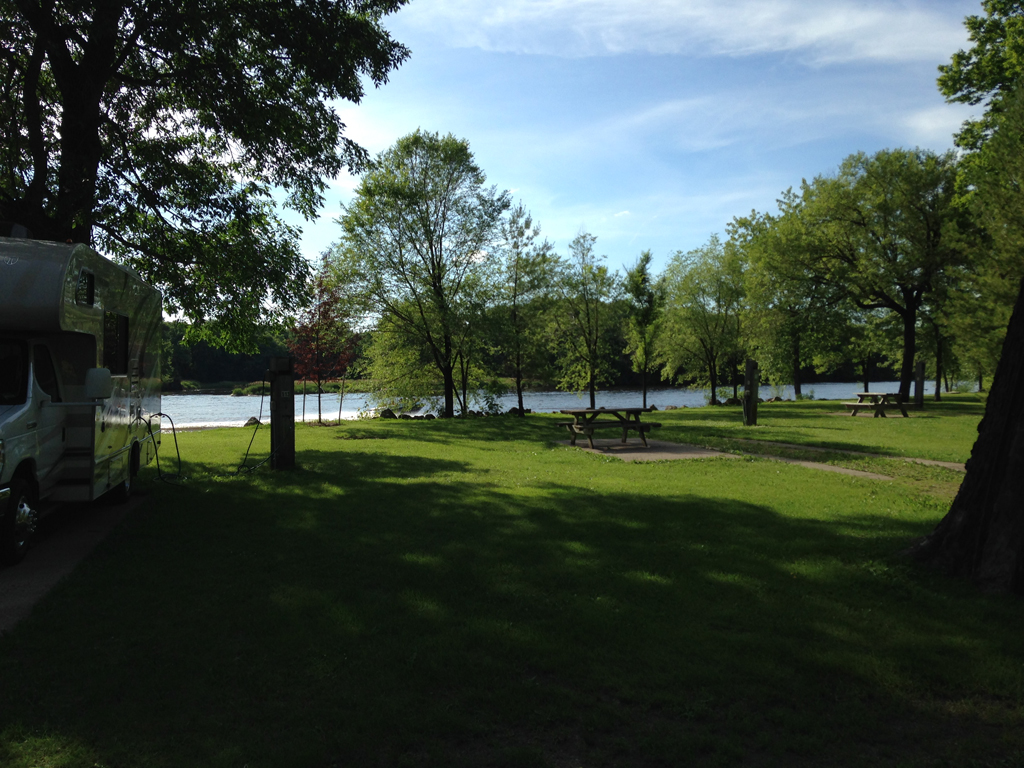 Where we were, instead, was the Pettibone Resort RV Park, a lovely place on the Minnesota-Wisconsin border. There's a little banquet facility, a camp store, a playground, a basketball court, canoe rentals, and a scenic bar and deck overlooking the west channel of the Mississippi River. In fact, it's actually located on the south end of Barron Island--smack dab in the middle of Ol' Man River.