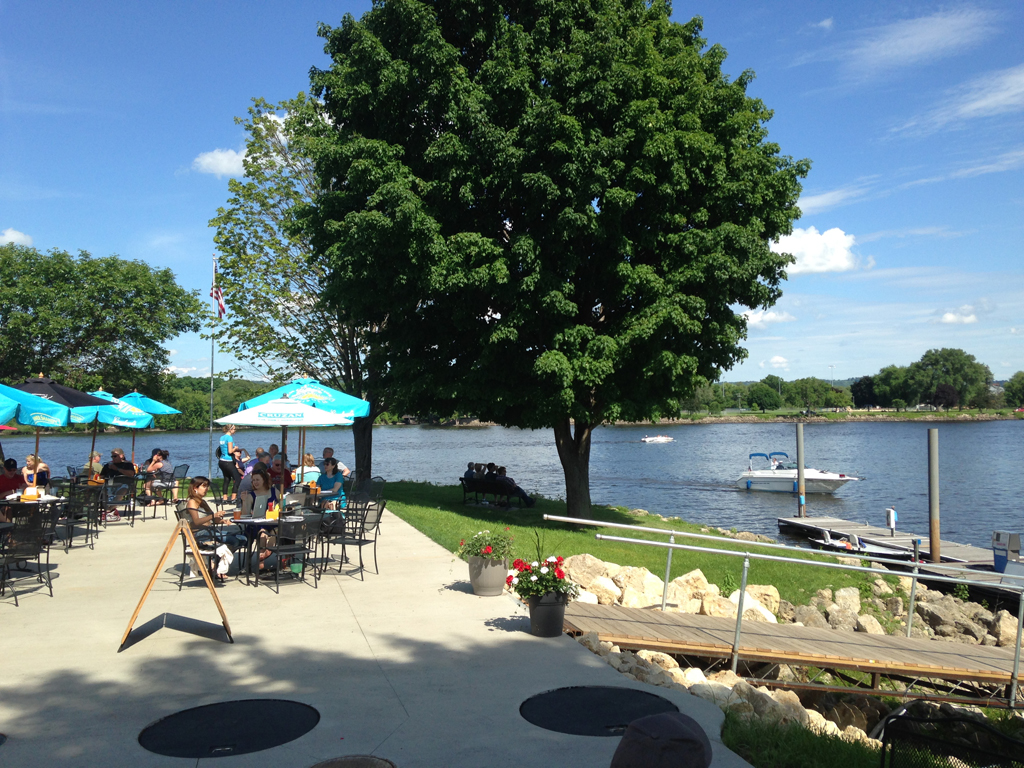 But instead, we walked up it a bit, then down to the banks of the river, still in our side of the waterway. In a quest for a joyous happy hour, we made our way to the Pettibone Boat Club.