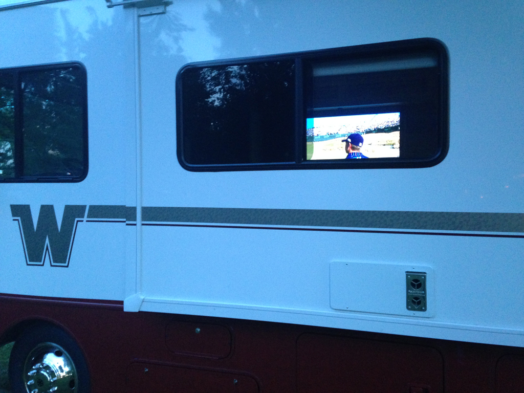 TV visible through window of Winnebago motorhome