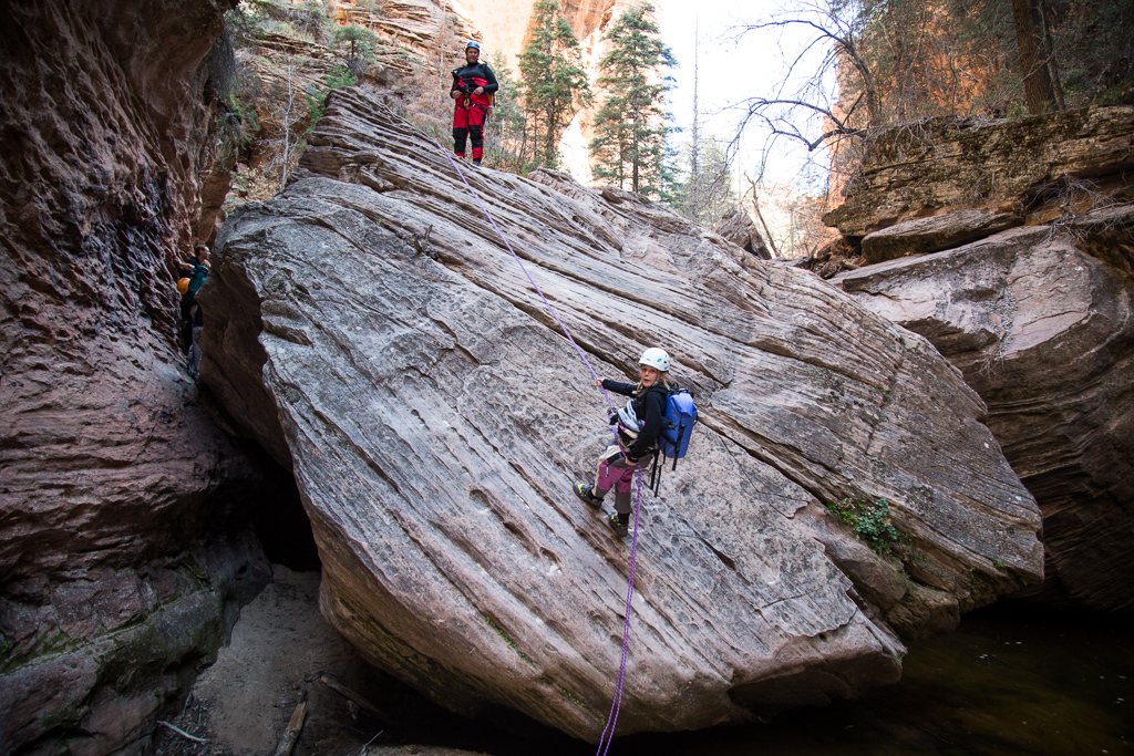 We are only a little over half way through our nine mile journey, so after an hour of R&R, we pack up and continue downstream. Within minutes we come to the last major obstacle of the canyon, a thirty foot rappel down a vertical rock face. After the final roped descent, the canyon walls widen and we find ourselves scrambling down countless red rock ledges lining the riverbed that create a thousand miniature waterfalls.