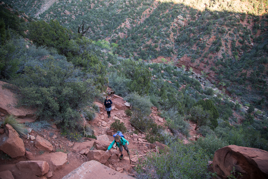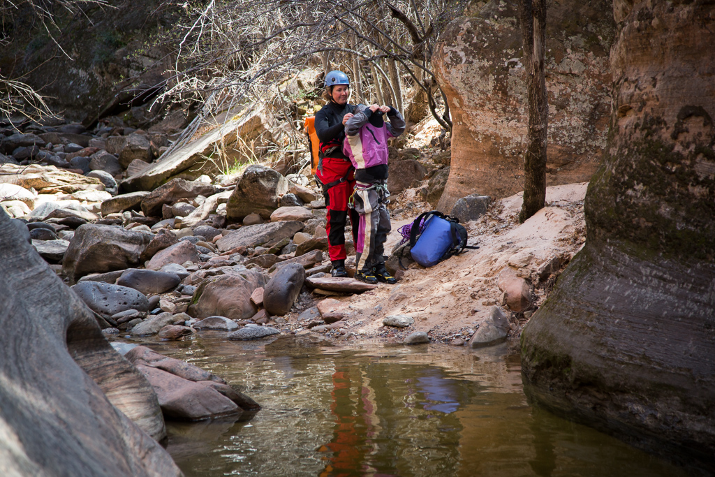 Kathy and Abby gearing up in preparation for their descent into the canyon.