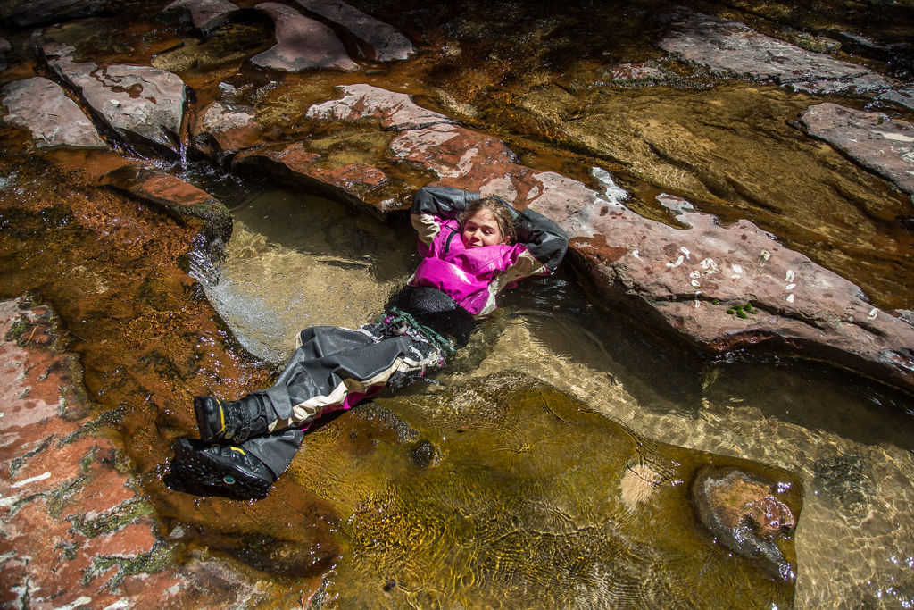 It is obvious where the name comes from: the rounded tunnel formation with striations that mimic the tile often found lining station walls coupled with a beam of light emanating from a bend in the cavern, give the impression of a subway tunnel with an oncoming train. Abby and I run ahead to explore the surreal tube, splashing through the puddles racing ahead to see what awaits around the corner. Abby discovers that at some point a warm springs has entered the canyon transforming a series of flooded potholes into miniature natural hot tubs. Peter lingers behind taking in the beauty through his photographer's eye. It is the perfect spot for an afternoon lunch break.