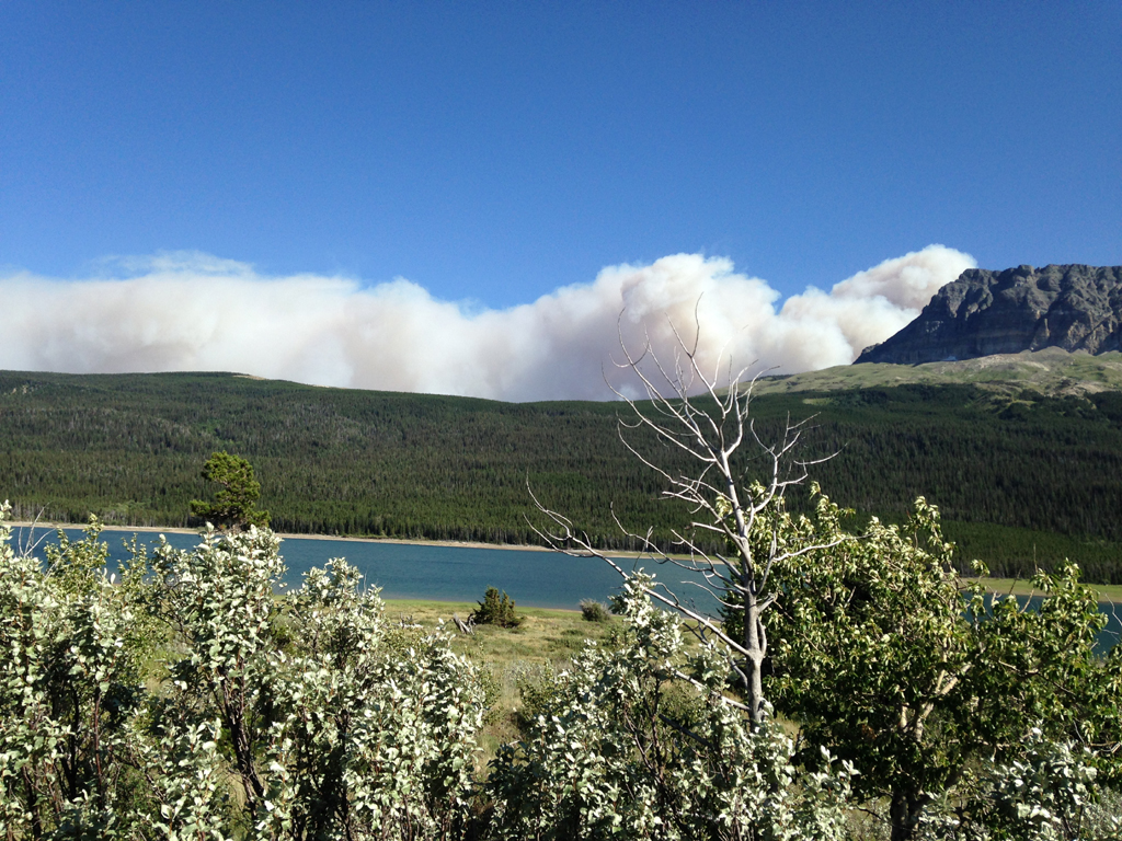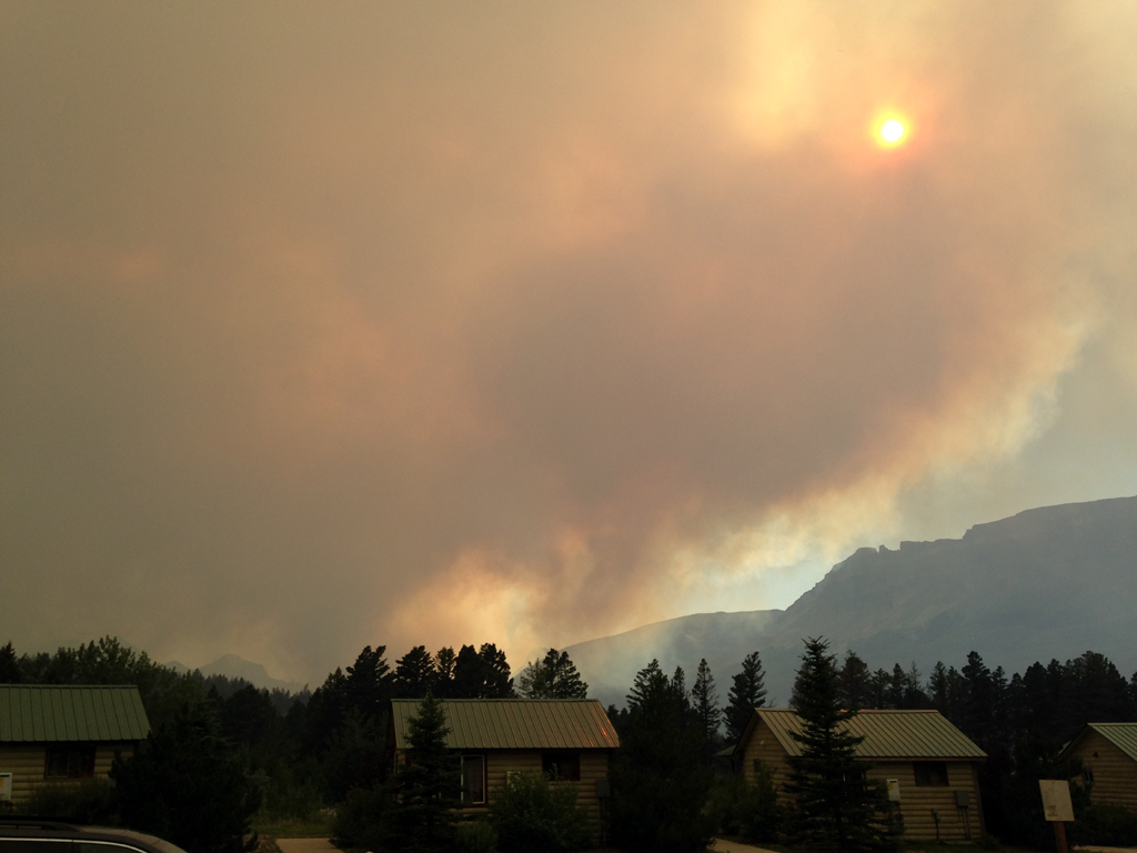 Wow. Two close and unexpected encounters with the wild in two days. Couldn't possibly happen again, right? Well, as we drove back toward our KOA Kampground in St. Mary, I noticed an unusual yellowish cloud rising above the mountain ridge amid an otherwise cloudless sky. That's strange, I thought.