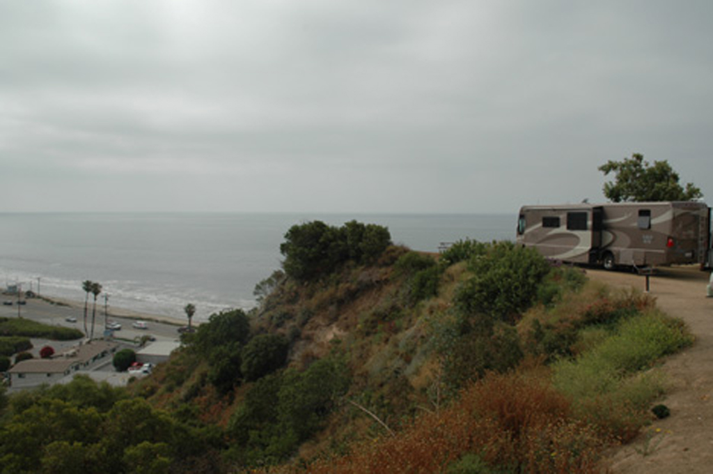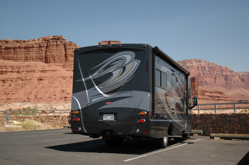 Our almost-33-foot peace-mobile is loaded with features, including two slide-outs (one of them a full-side slide), a king-sized bed, an electric-powered loft bed, a moveable dash console that slides between driver and passenger, and two LCD TVs (one of them a 46-incher that pops up magically next to the dinette).