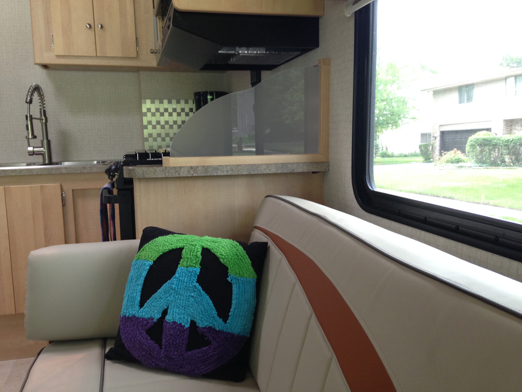 The exterior color scheme is called Crimson--n-Clover (other options: Woodstock tan, Mello Yellow, Bell Bottom Blue). Inside, we've added a peace sign pillow to complete the vibe. And we've brought along an iPod brimming with Janis Joplin and John Lennon.